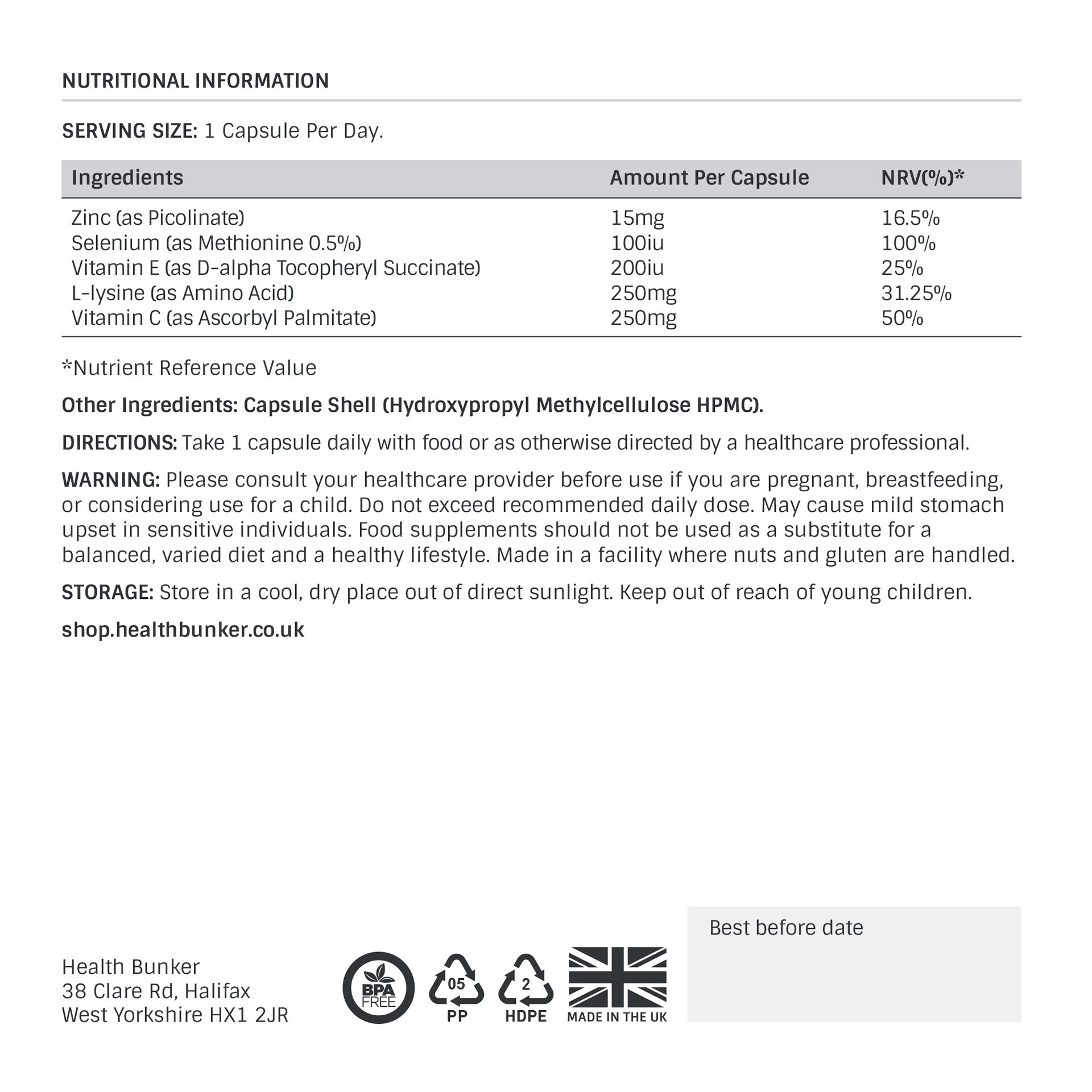 L-lysine (250mg) plays roles in protein synthesis, calcium absorption, and the production of hormones and enzymes. It’s also important for energy production, immune function, and collagen and elastin production.